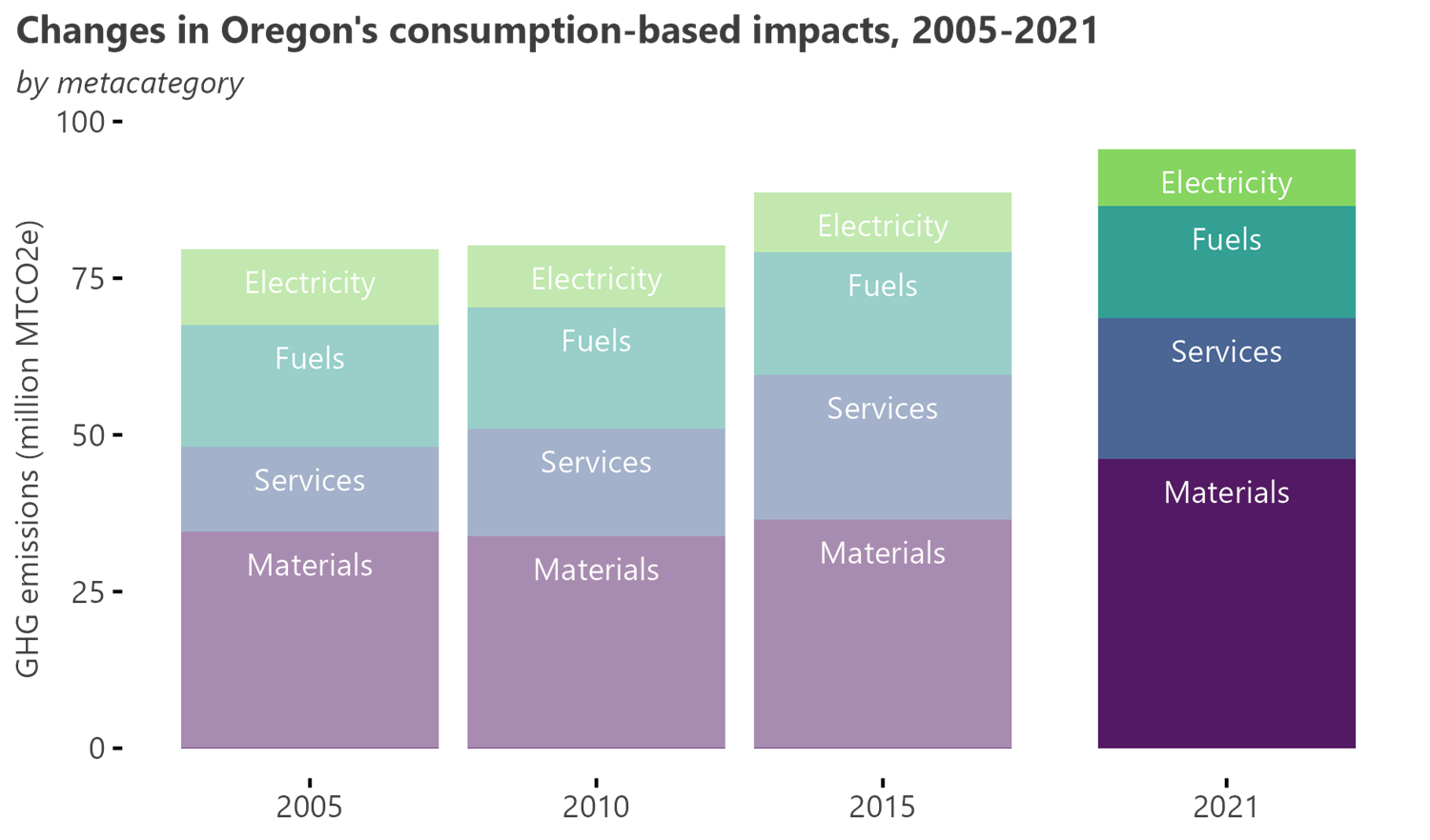 ‘Materials’ form the basis of all economic activities. The materials needed to build and maintain structures (e.g. buildings) and infrastructure (e.g. roads) in Oregon accounts for nearly 29% of Oregon’s overall climate altering greenhouse gas emissions. It shows the impact of the Oregon way of life in terms of climate affecting emission. The 2021 data shows how much we Oregonians rely on materials produced outside the state. They also reveal the deep inequity and vulnerability that can affect Oregonians differently.
